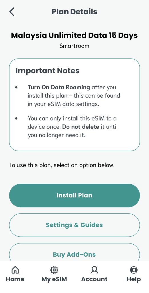 For Malaysia, there were different plans available, and we ended up choosing an unlimited plan for 15 days. You can check all the currently available Malaysia eSIM plans here